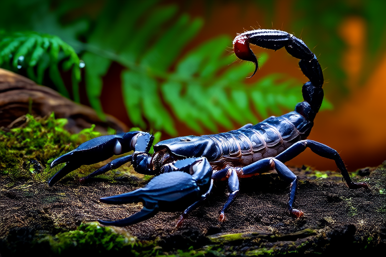 In their natural habitat, Heterometrus spinifer live in moist, humid environments, often found under logs, rocks, or within crevices. Their preferred temperature range is between 75°F and 85°F (24°C to 29°C), and they require high humidity levels, typically around 70-80%. These scorpions are solitary creatures, except during mating season, and they are highly territorial. They rely on their powerful pincers and venomous stinger to capture prey and defend themselves against threats.
